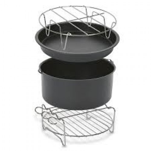 Set de 4 accesorii, cu diametrul de 20 cm, tavă pizza, vas copt, grătar friptură, suport frigărui compatibil cu modele de friteuze cu aer cald Easy Fry Tefal XXL.